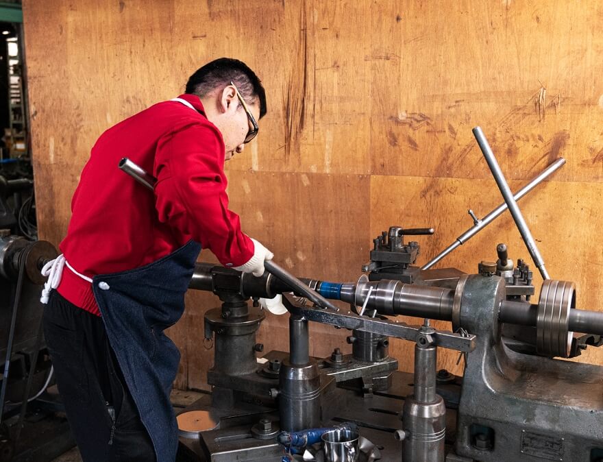 はじめました旋盤にとりつけた円形の金属板を回転させながら “へら” と呼ばれる金属棒を押し当て、少しずつ変形させて型と同じ形状の回転体に仕上げる加工技術。